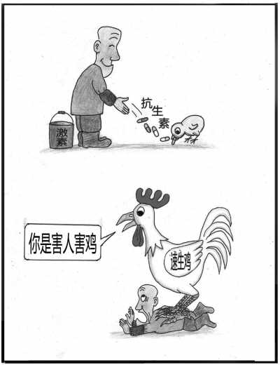 有媒体报道快餐店和超市里卖的鸡多是速生鸡,三四十天就长到四、五斤出售,而散养的土鸡要长一年多才能出售。速生鸡可以说是“抗生素当饭吃”,而且是否“加药”肉眼很难辨得出来。