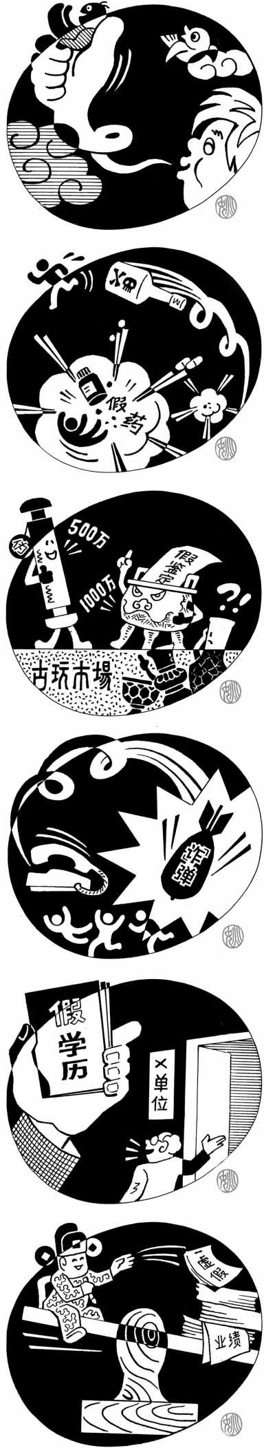从上至下:假话夸人真舒心;假药假酒真要命;假充文物真黑心;假案吓人真可恨;假造业绩真轻松
