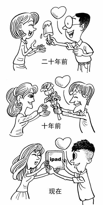 现在流行“与时俱进”,谈恋爱也是如此。二十年前谈恋爱送冰棍,十年前谈恋爱送玫瑰,现在谈恋爱得送iPhone。物价飞涨,那是通货膨胀惹的祸,谈恋爱的成本高涨,那是恋爱惹的祸吗?道理似乎说不过去。“面子工程”看来才是罪魁祸首。所谓你有我有她也要有。人家谈恋爱送iphone,我也不能落伍和“丢面儿”,起码也得弄个ipad。在恋爱物质化的今天,没有“钞票”做底座,谈恋爱难以成行。以往的“贫贱夫妻百事哀”的俗语正好成了如今年轻人的借口。在如此环境里,谈纯粹的精神恋爱,乌托邦似的,不是没有,但是凤毛麟角。大多数人都是俗人,俗人就得“入乡随俗”。谈恋爱讲究“票子”,无奈也没有办法,事实胜过雄辩。