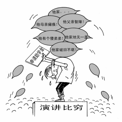 如果家境不好,很多人都不愿提及,可是沈阳大学某学院却要求贫困生靠演讲来“比穷”,得票最高者可获助学金。要当众揭伤疤,这让大多数的学生都不能接受。目前校方意识到了“比穷”危害性,开始着手修改测评认定的方式。