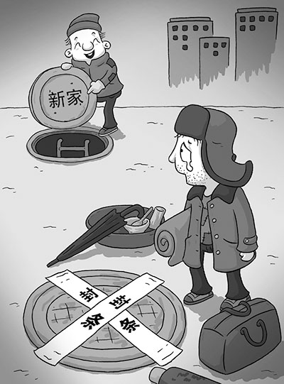 对城市管理来说,井口封上了,这是好事,但对于那些栖居在“井下”的“穴居人”来讲,这似乎是噩梦的开始。没有了窨井做栖息地,这些人到哪里去遮风避雨? 这些人栖息在窨井,以井为家,是一种无奈的选择。为了城市和这些人的生命安全,将他们驱除、搬离井下,这当然是必要的。可我们光驱赶他们,这并非“治本”之策。能不能给他们创造更为优惠的栖息地呢?在香港,为城市里特困人口和流浪人员,政府都会特别设置一些专门的场所,提供给这些特殊群体居住,如香港的“笼屋”、“床屋”。多些实际解决的办法,而不是一刀切地“封”,或许更为妥当。居住在井下已10年的王秀青,目前在有关部门的帮助下已找到了一份工作,不再居住在井下。但更多的“穴居人”没有这样的幸运,或被移送回老家,或继续躲藏在某个角落。他们的命运更应得到关注 。城市发展,离不开外乡人的参与。城市治理,不能不顾及他们的生活。安置好这些“流浪”的“蜗居者”,不仅是城市治理的必要课题,也是城市发展,文明建设、和谐社会应有的标准。