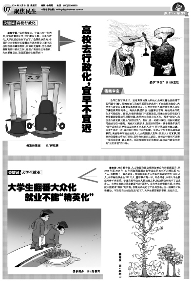 改革已到了深水区,没有勇闯的魄力和决心是难以撼动盘根错节的利益“纠缠”。而教育部门的改革更是诸多改革中不容忽视的部分。大学去行政化应是教育改革的着力点。只有大学的人事权和经费不再仅仅攥在教育部的手上,高校由教授治校、校董事会管理,高校的去行政化才可能成行。目前,行政职能部门不愿意放权,而身处高位的校长们享受着副省级或厅局级待遇,改革的内在动力也不大。两者“合谋”,高校去行政化就只能是“画饼充饥”。然而,这一问题不解决,创新问题就可能成为空中楼阁。高校无心搞学术,创新从何而来?钱学森晚年发问“为什么我们的学校总是培养不出杰出人才”?估计将成为无解之谜。 从这个层面上看,高校去行政化已迫在眉睫。全球人才的竞争会越来越激烈。高校培养不出杰出的人才,如何跟别人竞争?没有人才的累积,国家的创造能力将大打折扣,竞争力也就无从谈起。高校去行政化可谓牵一发而动全身,意义重大。而没有顶层设计的推动,高校去行政化又将是“以后再说”的下场。