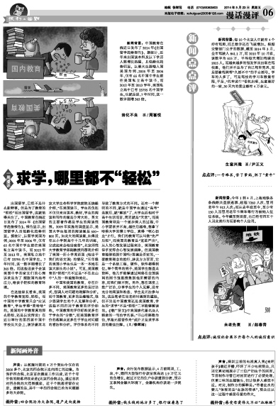 在这些家长看来,美国的中学教育宽松、轻松。而中国的中学教育只会“应试教育”,学生学得“苦哈哈”的。美国的中学教育真的那么轻松,还是以讹传讹?在近日举行的第四届中国中学校长大会上,演讲嘉宾北京大学生命科学学院前院长饶毅介绍,“在美国读书,学生的负担不仅仅来自课本、教材,学生的阅读和写作的量是非常大的,英文的主要著作都是学生的阅读范围。2009年实施的调查显示,美国大学生每周的阅读量是500~800页。如此大的阅读量,如果没有从小学到高中十几年的训练,完成起来会相当痛苦”。北京师范大学教育学部副教授向蓓莉介绍了美国一所小学英语课(相当于我们的语文课)的情况,“五年级的美国小学生也是一本一本地在读大部头的小说”。可见,美国教育的“轻松”只不过是“不在此山中”人的一种遐想和美化。