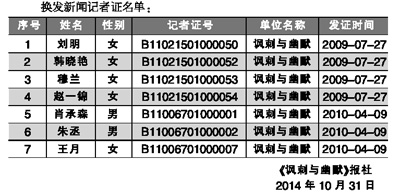 根据国家新闻出版广电总局《关于2014年换发新闻记者证的通知》(新广出发〔2014〕59号)文件要求,我单位《讽刺与幽默》报社已对换发记者证人员的资格进行严格审核,现将我单位换发新闻记者证人员名单进行公示,公示期为2014年10月31日。举报电话为65363805。