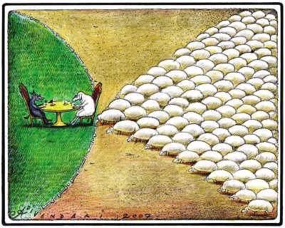 狼来到小溪边,看见小羊正在喝水。狼非常想吃小羊,便说:“你把我喝的水弄脏了!” 小羊吃了一惊,温和地说:“我怎么会把您喝的水弄脏呢?您站在上游,水是从您那儿流到我这儿来的呀!” 狼气冲冲地说:“就算这样你也是个坏家伙!我听说,去年你说过我的坏话!” 可怜的小羊喊道:“啊!那是不可能的事,去年我还没有出生哪!” 狼不想再争辩了,龇着牙,大声嚷道:“你这个小坏蛋!说我坏话的不是你就是你爸爸,反正都一样。”说着就往小羊身上扑去。