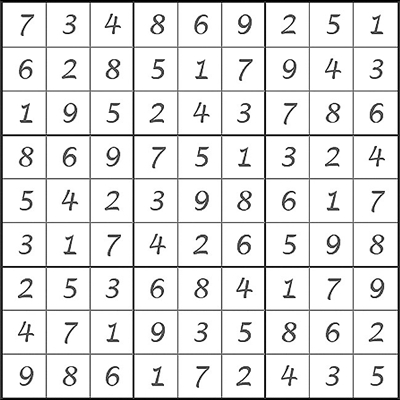 在每个小格子里填入1-9中的数字,使得每个数字在“九宫阵”的每行、每列、每个宫格中均只出现一次。