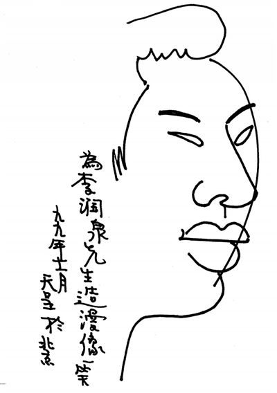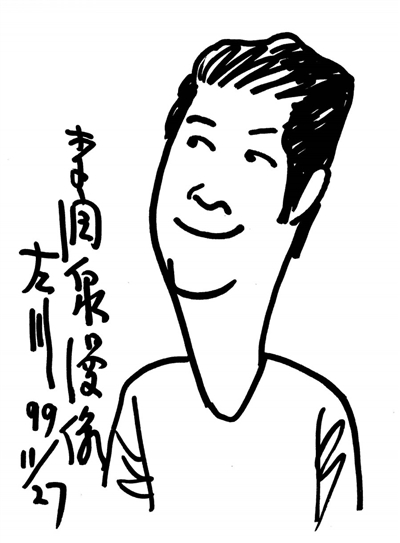 我回到房间,北京电视台的记者刚采访完沈天呈老师,正从房间中出来,我连呼错过了聆听沈先生创作高见的大好机会。临睡前,我拿出速写本,请他为我画一幅肖像。沈先生选了我的一个侧面,观察了大约两三分钟,然后一挥而就,我的侧面像就完成了。对这件漫画像,妻子有这样的评价:画出了我桀骜不驯的神态!左川和天呈两位先生为我画的漫画像,现在已被我用在名片的正反面上了,真诚地感谢两位漫画前辈!