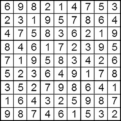 在每个小格子里填入1-9中的数字,使得每个数字在“九宫阵”的每行、每列、每个宫格中均只出现一次。(答案见下图)