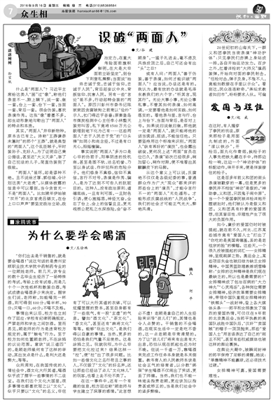 “两面人”虽坏,却是谬种不绝。且不说徐才厚、郭伯雄、令计划这类“大老虎”,从媒体披露的信息中可以看到,当今贪官无一不是“两面人”。比如猴年伊始被“双开”的北京首虎吕锡文,在台上口口声声“要坚定政治立场,政治定力,在重大考验面前旗帜鲜明,在大是大非面前立场坚定”,到台下则营私舞弊;当面说“始终忠诚于党,忠诚于信仰,忠诚于人民”,背后却妄议中央、背叛信仰、坑害人民。另有一些“言论”虽不多,行动却特会装的“两面人”。原四川彭州市委书记陈家荣因贪腐被拘之前常以“俭朴”示人,扣门得近乎吝啬;原秦皇岛市煤炭检测中心主任李小林整天装穷叫苦,私下竟将1500万元公款埋到地下化为己有……这些两面人“忠于人民忠于党”的“口头禅”如同小和尚念经,不过是有口无心,招摇撞骗。