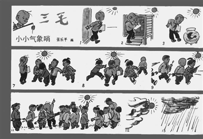 直至“四人帮”被打倒后,张先生重获创作自由,三毛才得以解禁。1977年6月1日,《解放日报》刊登了组画“三毛学雷峰”(该系列画陆续刊载至1978年6月),这是三毛在“文革”后首次露面。接着,当年10月,三毛在《红小兵》画刊(1977年第20期)上现身,以小连环画“小小气象哨”向久违的小读者们问好。这套连环画刊登于画刊