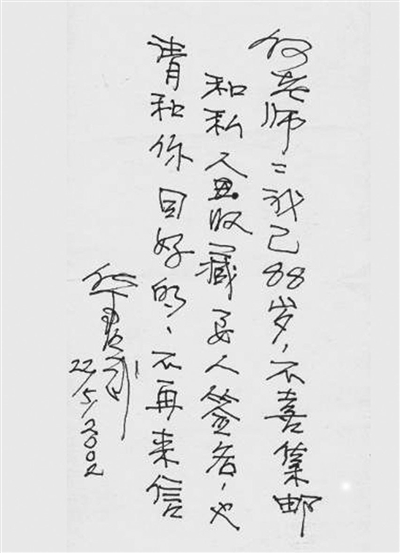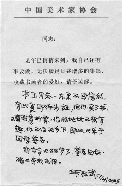 下面这封短札是我从网上淘来(现由我收藏),是华君武前辈于2002年写给湖北一中学教师的回信。信中写道“何老师,我已88岁,不喜欢集邮和私人收藏要人签名,也请和你同好的,不要再来信”。该信共35字,使用了华老专用画笺,字迹工整,语气严厉,想必已被络绎不绝的求索签名和字画者搞得心烦意乱。众所周知,华老是中国漫画界老前辈,被叶浅予誉为中国漫画史三大师之一(另两人是民国期间沈伯尘和黄文农),又长期担任美协领导,应各方要求题字赠画不计其数,然我泱泱中华,有十三亿民众,爱好艺术或想借此渔利者数量庞大,而以华老一耄耋老者,又怎能应付得过来,也难怪他老人家措词严历,不留情面。