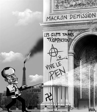 在法国愈演愈烈的“黄马甲”暴力抗议活动中,历史地标凯旋门内部遭洗劫,国家象征玛丽安雕像遭人砸毁,抗议人士在凯旋门外写上“推翻资产阶级”和“马克龙下台”等标语。