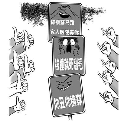 “你丑你横穿!”“还横穿马路,被撞就死翘翘!”一段厦门海翔大道附近公路竖立的警示牌如此“霸气”,因而引发争议。——警示言语,能让人乐意接受且不反感,同时也能达到警示作用的确也是一门学问。