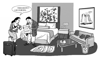 杭州萧山区一家宾馆垃圾分类有新招:该宾馆设有环保客房,这种客房里没有酒店六小件,房间里配有分类垃圾袋,另外,住客可以通过垃圾分类知识答题等方式来获得一套洗漱套装或者享受酒店协议价。——举手之劳,既能尽到公民责任,还能拿折扣得实惠,何乐而不为?