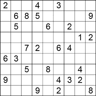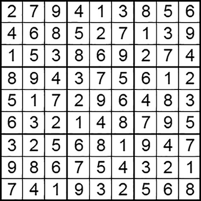 在每个小格子里填入1-9中的数字,使得每个数字在“九宫阵”的每行、每列、每个宫格中均只出现一次。(答案→)