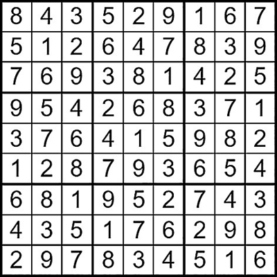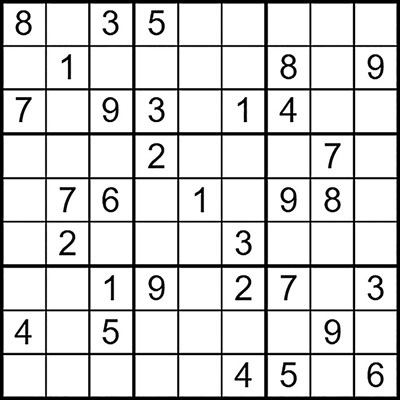 在每个小格子里填入1-9中的数字,使得每个数字在“九宫阵”的每行、每列、每个宫格中均只出现一次。(答案→)