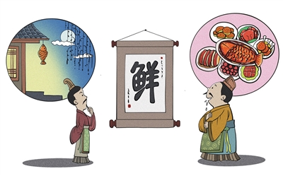 于是,沿着“鲜”字的来龙去脉追寻,果真有说法。“鱼”字在甲骨文中是全鱼的象形,有头、鳍、身和尾;“羊”是正面羊头的象形。自西周始,鱼羊组合成“鲜”字。其实,甲骨文后,“鲜”字还出现了一个异体字,是由三条鱼组成——鱻,《说文解字·鱼部》:“鱻,新鱼精也。从三鱼,不变鱼。”“新鱼精”的意思是指新鲜的鱼,没有变质的鱼。进入农耕时代,人类开始驯养动物,羊很快成为人们大爱的食物。鱼是先人较早尝到的美食,羊是游牧文化的表征,一凉一热,一阴一阳,两者合烹,就呈现最佳状态的“鲜”美。如此看来,“鲜”字从“鱼”从“羊”,可谓顺情顺理。比较著名的鲜味传统名菜,一道是鲁菜系的“鱼腹藏羊肉”,传说是春秋时代名厨易牙所创;另一道则是苏菜系的“羊方藏鱼”,有4300多年的历史。直到今天,羊肉鱼肉两鲜融合为一鲜,造型美观,色泽红润,不腥不膻,鲜味浓郁,仍深受食客们的欢迎。