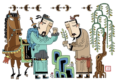 另一个重要仪式是设宴送别。古代为了便于行旅休息,在驿路上每隔10里设一长亭,每隔5里设一短亭,近城的长短亭便成了设宴送行的处所。所以我们在送别诗里经常看到长亭短亭的意象,诸如柳永的“寒蝉凄切,对长亭晚,骤雨初歇”,晏几道的“客情今古道,秋梦短长亭”。总而言之,我们不难从这些诗词中还原出当时的离别场面来。文人送别时除了饮酒作诗,有时还会赠行路人特殊的礼物,比如折柳送别。因为“柳”与“留”音相近,所以折柳送别便有挽留之意。《三辅黄图·桥》记载:“灞桥在长安东,跨水作桥,汉人送客至此桥,折柳赠别。”于是,灞桥柳便成了唐宋以来诗歌中一个重要的表达离别的意象。