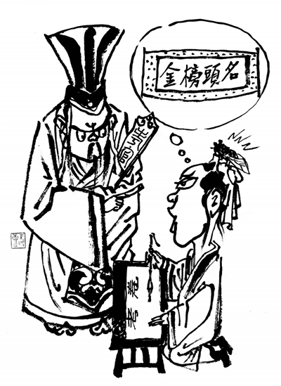民间喜欢讨“口彩”的习俗,勉强也能归入“双关法”的范畴。《笑林广记》中有一则《头鸣》的笑话,就是讨“口彩”的双关:某处举行科举考试,严肃的考场上,突然冒出了蝉鸣声。众人大笑。监考的学使查问原因,有人检举说,某考生头上的儒巾里有蝉在叫。学使询问这位出问题的考生,考生禀告考官,说是父亲在我临进考场时把蝉塞进儒巾里的,这东西在我头巾里爬来爬去,难受极了。因为是父命,也不敢扔掉。考官好奇,问塞一只蝉干什么?考生说:“它不是能让我‘头鸣’嘛!”哈,原来“头鸣”就是“头名”啊!如果“头鸣”就能带来“头名”,一考场的考生,每个人都头戴一个发声的昆虫来,这个考场的热闹,就可想而知了。