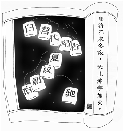 顺治乙未冬夜,天上赤字如火。其文云:“白苕代靖否复议朝冶驰。”