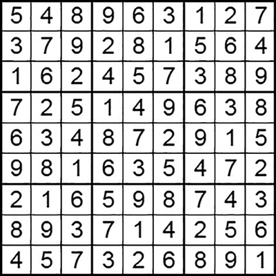 在每个小格子里填入1-9中的数字,使得每个数字在“九宫阵”的每行、每列、每个宫格中均只出现一次。(答案→)