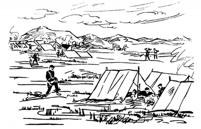 中国工农红军的长征是一部伟大的革命英雄主义史诗。中国共产党员和红军将士在长征中所表现出来的坚定的共产主义理想、革命必胜的信念、艰苦奋斗的精神和一往无前、不怕牺牲的英雄气概,成为长征得以胜利的精神支柱。如当时参加长征的林伯渠已年届五十,“他和几位革命老人参加长征的壮举,老当益壮的精神,给予红军指战员以极大的鼓舞”。《草地宿营》(图二)是红军战士黄镇于长征途中所画,图中的战士们面对风雨、泥泞、寒冷的折磨和饥饿的煎熬,休息间隙仍轻松谈笑,流露出战天斗地、不畏艰险的革命乐观主义。