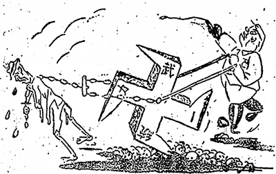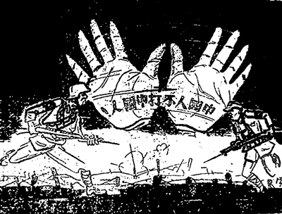 1946年3月召开的国民党六届二中全会上,蒋介石否定了1946年1月召开的重庆政治协商会议的决议,其否定协议扩大内战的行动,使政协协议成为一纸空文。1946年6月,国民党军队22万人悍然围攻鄂豫边境的中原解放区,拉开了内战的序幕。此后,中国进入通过武力解决内争的轨道,正如漫画《如此耕耘,小民遭殃》(图二)所示,国民党走上武力统一的路,和平谈判破裂,百姓又成了牺牲品。