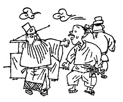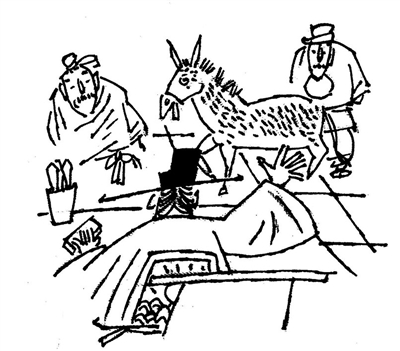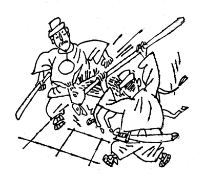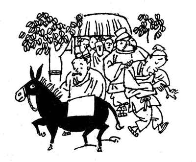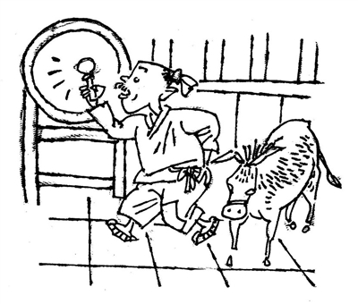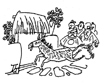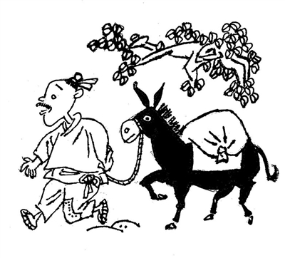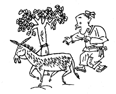 9.衙役们纷纷拿起板子痛打瘦驴,打得瘦驴又蹦又跳,放声大叫。 |