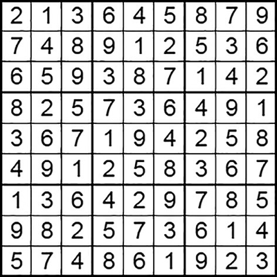 在每个小格子里填入1-9中的数字,使得每个数字在“九宫阵”的每行、每列、每个宫格中均只出现一次。(答案→)