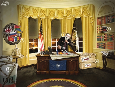 祸源 1.美国政客头戴“和平”面具。 2.在世界地图上“点燃”乌克兰。 3.《脆弱帝国:俄罗斯怎样爱上和抛弃普京》,一本由英国人本·朱达编撰的诋毁普京形象的书籍。 4.美国国家民主基金会、索罗斯基金会,向外输出“民主”颠覆他国政权。 5.被制裁封锁的俄罗斯石油。 6.美制“爱国者”导弹防御系统。 7.星条旗飞镖锁定俄罗斯、乌克兰、格鲁吉亚、吉尔吉斯斯坦、摩尔多瓦、白俄罗斯目标。 |