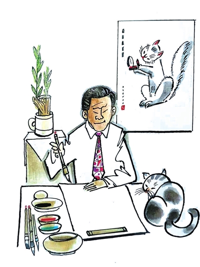 江大爷做事和作画都干脆利落。初见他,都觉得有点“脸冷”,可是跟他说起漫画创作立马亲切起来,他对勤学的青年作者有一副“特殊”的热心肠,难怪他和那么多年轻人都是忘年之交。记得1982年我为《讽》报画了一幅揭露黄色录像毒害青年的漫画,江大爷给我打来电话:“画的立意挺好,不过录像带不太像,你下班等我……”于是,他带我去了电器商店,不但看了实样还看了如何操作录像机。江大爷和我都是爱猫一族,他很喜欢我家的“虎斑”猫,想让两家的宠物“结亲”,我当即赞同,可是我老婆立马嘲笑我是糊涂虫——咱们的猫儿不是早就做绝育手术了吗?
