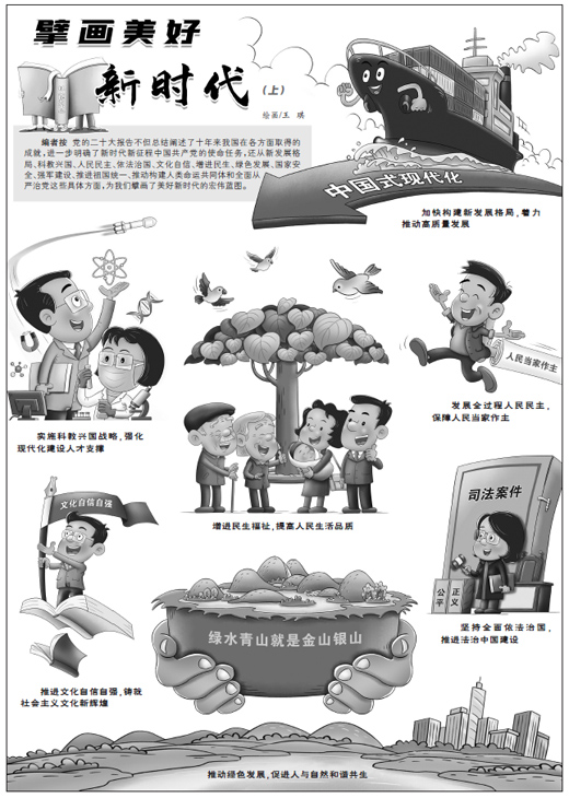 编者按 党的二十大报告不但总结阐述了十年来我国在各方面取得的成就,进一步明确了新时代新征程中国共产党的使命任务,还从新发展格局、科教兴国、人民民主、依法治国、文化自信、增进民生、绿色发展、国家安全、强军建设、推进祖国统一、推动构建人类命运共同体和全面从严治党这些具体方面,为我们擘画了美好新时代的宏伟蓝图。