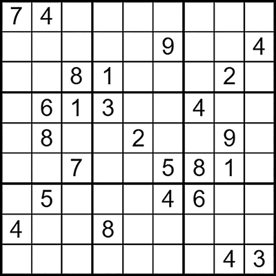 在每个小格子里填入1-9中的数字,使得每个数字在“九宫阵”的每行、每列、每个宫格中均只出现一次。(答案→)