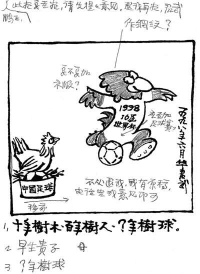 1998年法国世界杯即将举办,华老创作了一幅漫画。他先把草图寄来,很谦虚地征求意见。画的主题内容,充满了对足球的热爱和对中国足球的期望。