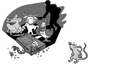大难临头!老鼠赶忙溜走,它要把这个危险信号告诉农场里所有的动物。老鼠先遇到了公鸡,绝望地对它说:“农场主刚刚放了一只夹子。”公鸡冷漠地回应道:“你确实该为自己担心,不过,这跟我又有什么关系呢?”