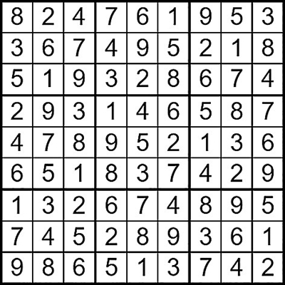 在每个小格子里填入1-9中的数字,使得每个数字在“九宫阵”的每行、每列、每个宫格中均只出现一次。(答案→)