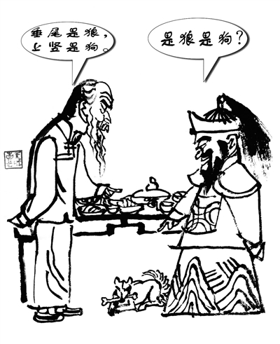 清代两个重臣纪晓岚、和珅经常在一起活动,他们之间开玩笑的段子,常有流传。当时,纪晓岚的官职是侍郎,而和珅是尚书。有一次两个人同席,和珅见一只狗在桌子下面啃骨头,便假装不认识,问道:“是狼是狗?”纪晓岚知道他来者不善,便立即回道:“垂尾是狼,上竖是狗。”和珅想说“侍郎是狗”,纪晓岚则指出,“尚书才是狗”。