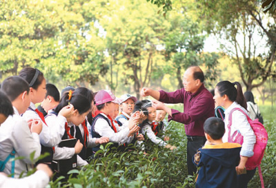 近几年,每到春天的采茶季,凤凰山茶厂的陈保英便一边忙着组织工人采茶,一边忙着迎接来研学的学生。在凤凰山上,陈保英的茶厂种植了280亩茶园,农忙的时候,就请周边的村民来帮忙。一到周末,前来体验采茶、炒茶等工艺的研学团络绎不绝,最多的时候一天接待了600名研学的学生。“我们给每个小朋友配置了衣服、采茶背篓,带他们参观和体验制茶过程,最后还会让他们带一小袋茶叶给家人品尝。”陈保英告诉记者,陆器的读书台就在茶厂附近,研学团的老师们也会把当地的历史文化讲给孩子们听。“陪同孩子来参加研学游的家长们实地看到了茶厂的种植、制作情况,也会购买茶叶,这一定程度上带动了当地茶叶的销售。”