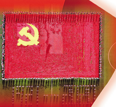 6月29日,山东省沂南县第一实验小学的小学生用红领巾拼成巨幅党旗。 |