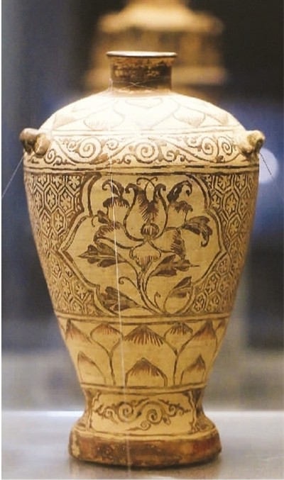 自唐代开始,随着广州海外贸易的兴盛,深圳成为“粤海门户”、广州海外交通之外港。深圳出土的各类外销瓷器,是了解海上丝路贸易状况的重要物证。南头后海元代墓葬中出土的两件褐彩牡丹纹梅瓶,在橙黄素胎上用褐彩绘画各种花纹,绚丽雅致。据考证,这两件梅瓶为元代海康瓷窑产品,是广东本地具有代表性的古代陶瓷艺术佳作。
