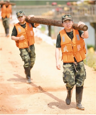 7月13日,武警江西总队机动支队官兵在江西省鄱阳县双港镇双丰村赵家湾水库堤坝上搬运木材,加固子堤。 |