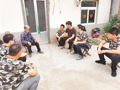 山东省胶州市三里河街道成立了退役军人志愿服务队,时常到当地老年人家中走访慰问,帮老人收拾屋子、量血压等。图为服务队到当地卜落林村看望老人。