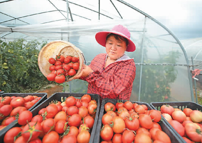 近年来,贵州省毕节市黔西县莲城街道办事处鼓励和引导村民发展蔬菜种植,提高土地种植效益,帮助村民增收致富。图为村民在采摘西红柿。 |