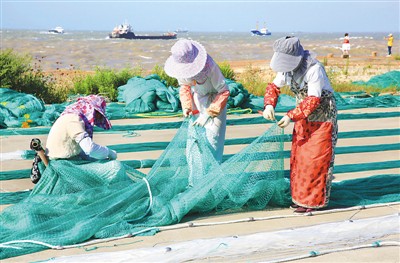浙江省温岭市自5月1日进入伏季休渔期来,渔民休渔不休工,纷纷抓紧时间修补渔网、保养船只和参加培训学习,为伏休季后的出海作业做准备。图为7月19日,在温岭市石塘镇东红新村位于海边的绿豆咀渔网修补场,渔家妇女在补网。