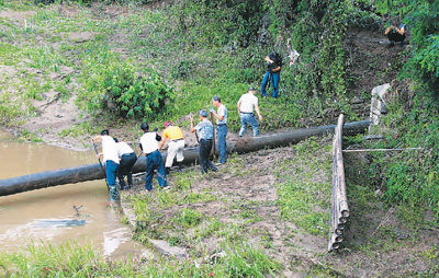 工作人员搬运被洪水冲到下游的彩虹桥大梁。 |