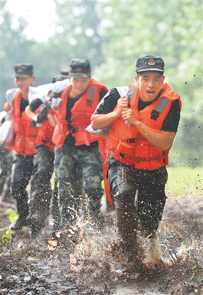 图为武警合肥支队党员骨干在安徽省铜陵市叶洲堤段抢运沙袋。 |