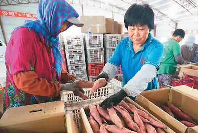 近年来,河北省滦南县采取“公司+合作社+农户”的模式,大力发展红薯新品种烟薯种植,促进农民增收。该县今年烟薯种植面积达3万亩,预计销售收入将达1.5亿元。图为7月24日,滦南县东黄坨镇薯泽专业合作社的员工在分拣刚收获的烟薯。