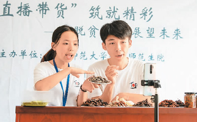 7月24日,在江西省吉安市新干县潭丘乡产业就业扶贫服务中心,江西师范大学暑期社会实践大学生正在直播推销当地农家小吃酱饼,助力乡村振兴。 |