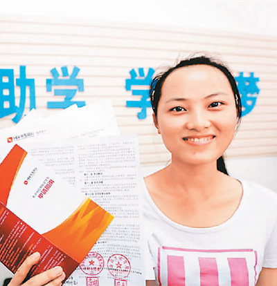 在海南省海口市海甸岛三西路海口市生源地信用助学贷款工作服务点,一名大学生在阅读相关信息,了解办理国家助学贷款事宜。