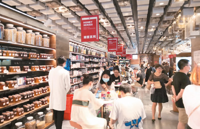 周末,知嘛健康壹号店内人流密集,顾客在门店一层品尝茶饮、选购商品。 |